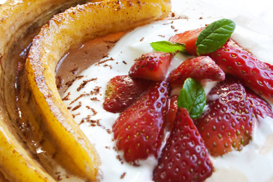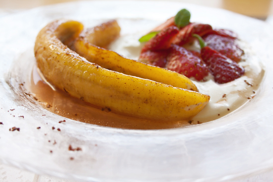 הקינוח הקלאסי, בננה ספליט, זכה לאינסוף וריאציות, בהן הבננה מככבת, או נעלמת מתחת לכדורי גלידה והררי קצפת. הרעיון של בננה ותוספות מפנקות מקבל כאן את גירסת החורף שלו, שמבוססת על זכרון ילדות של תותים עם שמנת וסוכר. אני מעדיפה את גירסת השמנת החמוצה על פני החלופה – גבינת מסקרפונה – שמחייבת את המשתמש להיפגש עם גבינה 40% שומן ומשאירה תחושת כבדות. הגירסה המבוססת על שמנת חמוצה משאירה טעם של עוד וצלחות נקיות גם בקרב סופרי הקלוריות.
