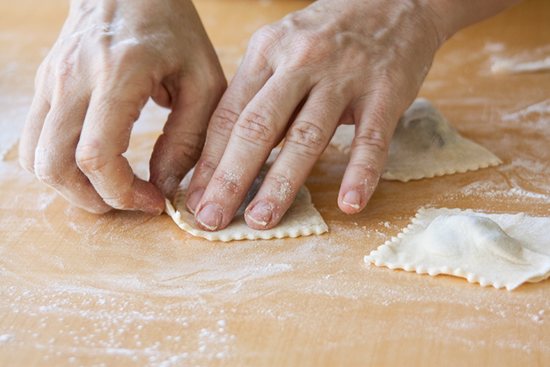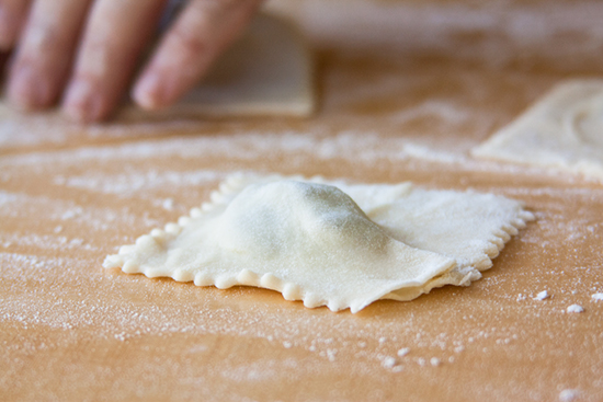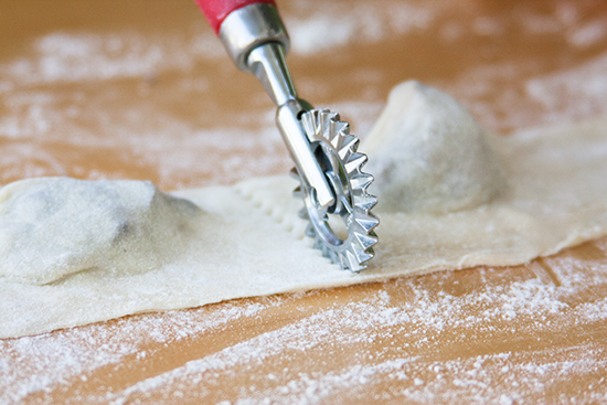 מהדקים בעדינות סביב המלית להוצאת בועות אויר. מורחים מעט מים על שולי הבצק התחתון להדבקה טובה בסגירה ומהדקים למניעת פתחים (דרכם יחדרו מים בבישול ויפוצצו את הרביולי). חותכים את הרביולי עם גלגלת שיניים מכל הצדדים. היא יוצרת שוליים יפים ועוזרת בהדבקתם.