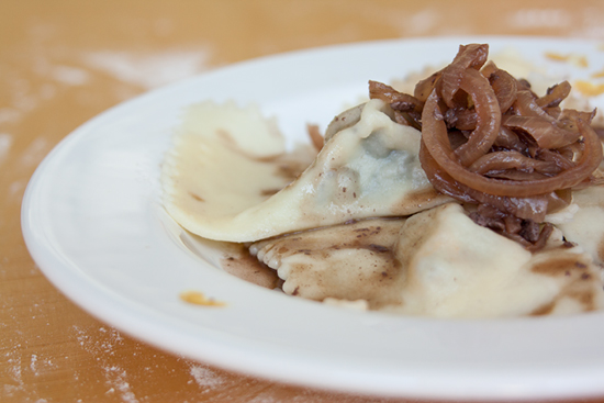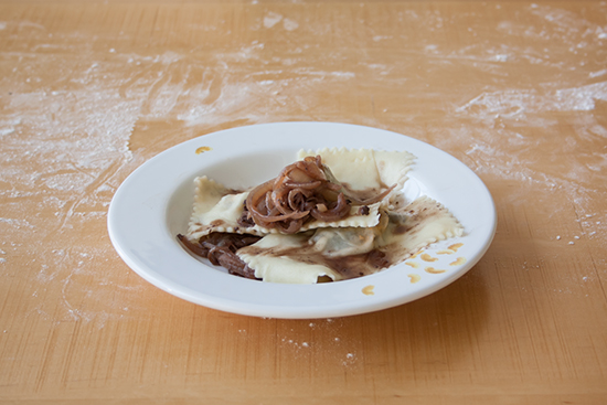 מסדרים 3 רביולי בצלחת, מעליהם ערימה קטנה של בצל מטוגן, מזליפים מהרוטב.