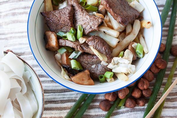 מנה מהירה, משביעה ובריאה יחסית. מבוססת על חלק לא שמן בבקר, עם ירקות מוקפצים ואגוזי לוז לקראנצ'יות.