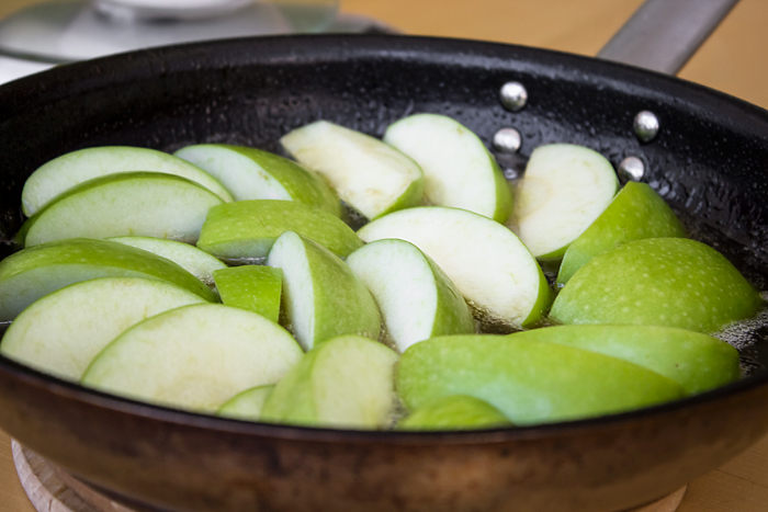 מגלענים תפוחי עץ וחותכים כל אחד לשישיות. מסדרים יפה על הקרמל. צורת הסידור היא זו שתיראה כשהעוגה תוגש. מחזירים לאש ומבשלים את התפוחים 5-10 דקות. מידי פעם מנענעים את המחבת שלא יידבקו ושיתקרמלו מכל הצדדים.