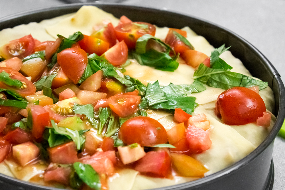 אם משתמשים בפסטה ביתית – ליצור רצועות שיעטפו את הלזניה מלמטה למעלה, כמו סרט של אריזת מתנה. מניחים את הפסטה על בסיס התבנית, מצמידים לשולים ומשאירים שוליים ארוכים, שיעטפו אותה מלמעלה.