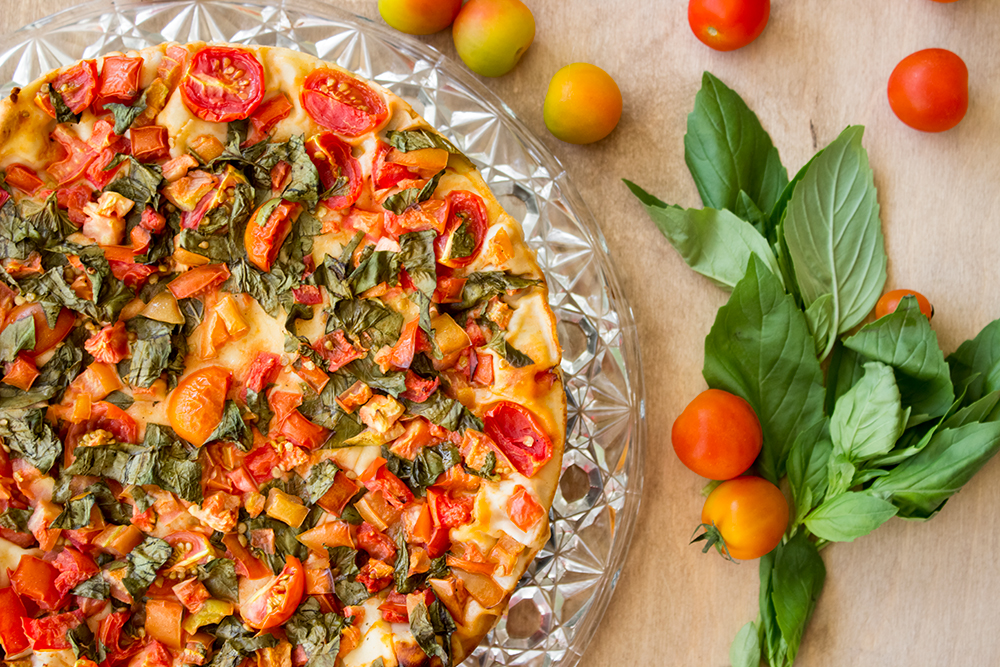 קוצצים שתי עגבניות טריות ובזיליקום. אם משתמשים בעגבניות שרי, חוצים אותן לאורך. מתבלים בשמן זית, מלח ופלפל, מוסיפים רסק עגבניות ומפזרים מעל.