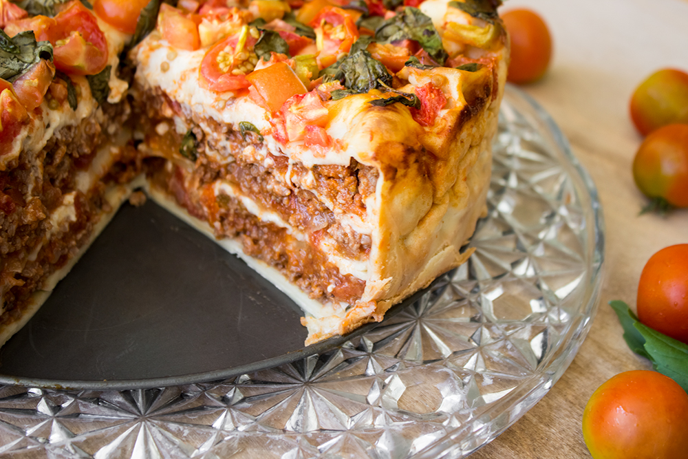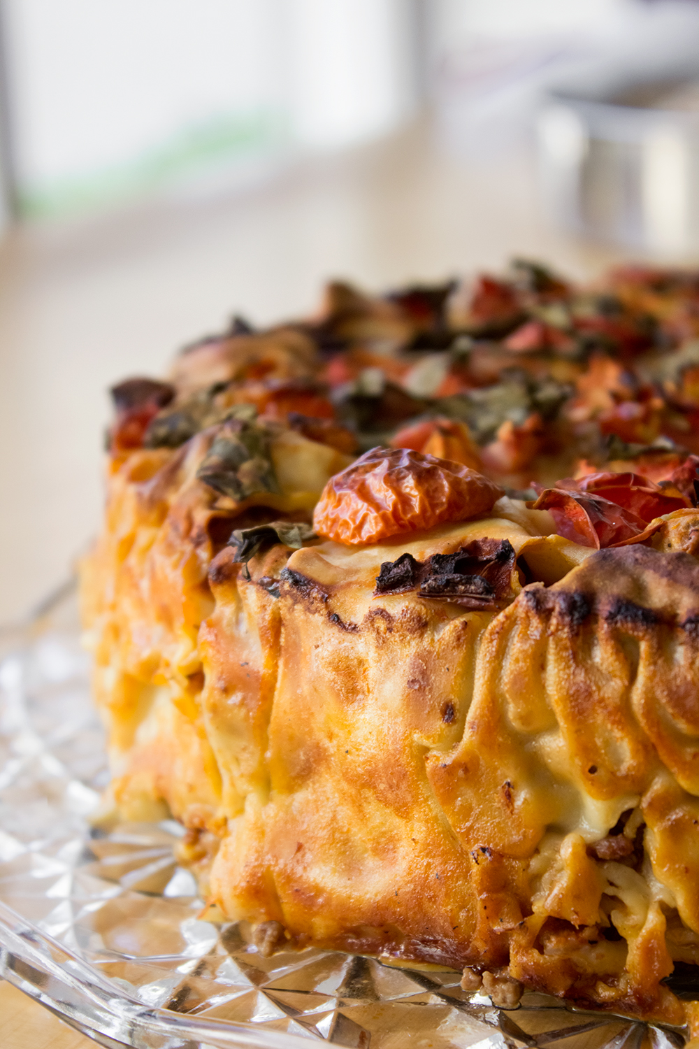 אם התלבטתם בין הכנת פסטה ביתית או רכישת פסטה מוכנה בחנות, הלזניה הזו יכולה להיות שובר שיויון. כשאנחנו שולטים באורך הפסטה, אנחנו יכולים ליצור ממנה מה שאנחנו רוצים. כך, רצועות ארוכות של פסטה רחבה יצרו מעטפת ללזניה, ואיפשרו להביא אותה בגירסה לא מלבנית ולא מרובעת, כמקובל, אלא עגולה כעוגה.