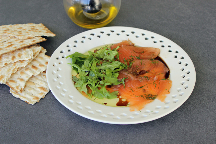 למנה ראשונה – אפשר להגיש קרפצ'יו גרבלקס סלמון. את הגרבלקס מכינים בחמש דקות עבודה ואפשר לעשות את זה כמה ימים לפני הסדר. ההתאמה: במקום פרמז'ן במקור מוסיפים עוד חומץ בלסמי.