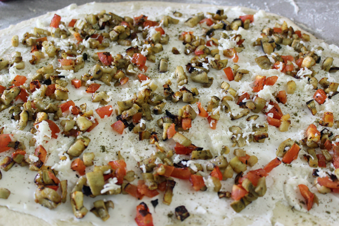 אחרי כשעה מחלקים את הבצק לשניים. מרדדים את החצי הראשון למלבן בעובי 3 מילימטרים. לוודא שיש מספיק קמח מתחת לבצק, כשמתחילים למלא אותו, כי אז הוא תופס לחות ונדבק למשטח העבודה. מורחים מחצית מהגבינה (אם היא עדיין קרה וקשה, אפשר לחמם כמה שניות במיקרו, שניתן יהיה למרוח אותה). מפזרים מעל מחצית מהעגבניות, החצילים והזעתר.