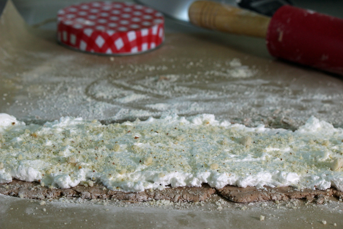 מורחים מעל שליש מהחלבונים המוקצפים. מפזרים מעל שליש מהאגוזים הטחונים, ומגלגלים.