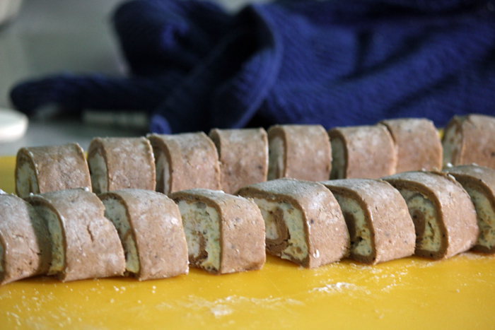 מוציאים כל גליל בניפרד מהמקפיא וחותכים עם סכין חדה לעיגולים בעובי הרצוי. מניחים על תבנית מרופדת בנייר אפיה.