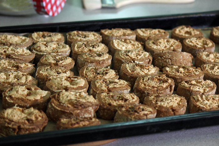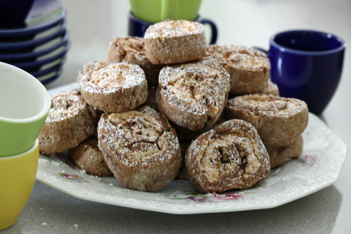 בקיצור – מכינים בצק, מרדדים, מקציפים חלבונים ומורחים מעל, מפזרים אגוזים, מגלגלים, חותכים ואופים.