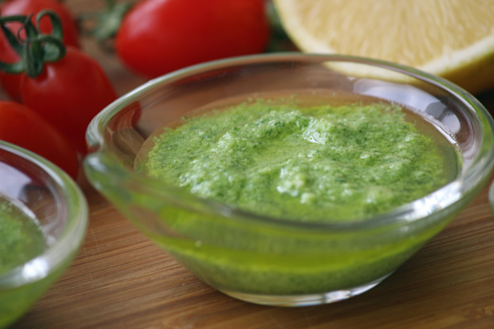 נסיונות אקראים להכנת פסטו לא זכו אצלי להצלחה במטבח. הוא מיהר להשחיר וטעמו היה מר. אתמול החלטתי שאני מכינה סנדביץ' פוקאצ'ה משפחתי ושלצורך זה אני חייבת פסטו. אז אילתרתי כמו תמיד עם מה שהיה בבית. את הצנוברים החלפתי בקשיו והחלטתי להוסיף לימון שבדרך כלל לא מופיע בפסטו. ההחלטה התבררה כסיפור הצלחה שגרם לי לקחת פרוסות לחם טרי שזה עתה נרכש ולהסתער איתן על השאריות בבלנדר עד הטיפה האחרונה. הלימון הוסיף כמובן לטעם ועל הדרך שמר על הצבע היפה של הפסטו. כאן בצילומים – 24 שעות לאחר הכנתו והפסטו שלנו עדין זוהר ורענן. כמובן שהוא מצויין גם כתיבול לפסטה.