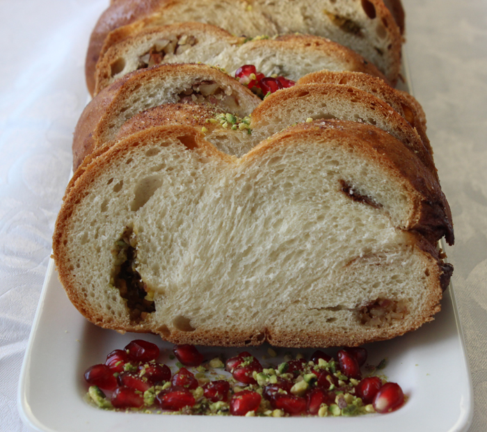 מזלפים לאורך המרכז של כל רצועת בצק פס דבש ומעליו מפזרים את המלית – שקדים באחת, קינמון בשניה ופיסטוקים בשלישית. סוגרים את הרצועות. אם הבצק לא נדבק היטב, משתמשים בקמח או מים, לפי מה שעובד יותר טוב. חשוב לא להשאיר פתחים ברצועות.