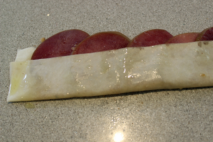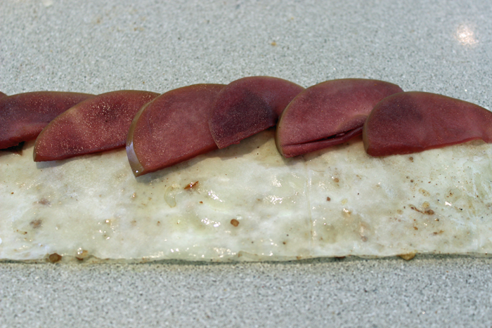 מניחים את פרוסות התפוח כשהן מעט חופפות בחלק העליון של הרצועה כך שהקצוות בולטים ממנה (ראו צילום).