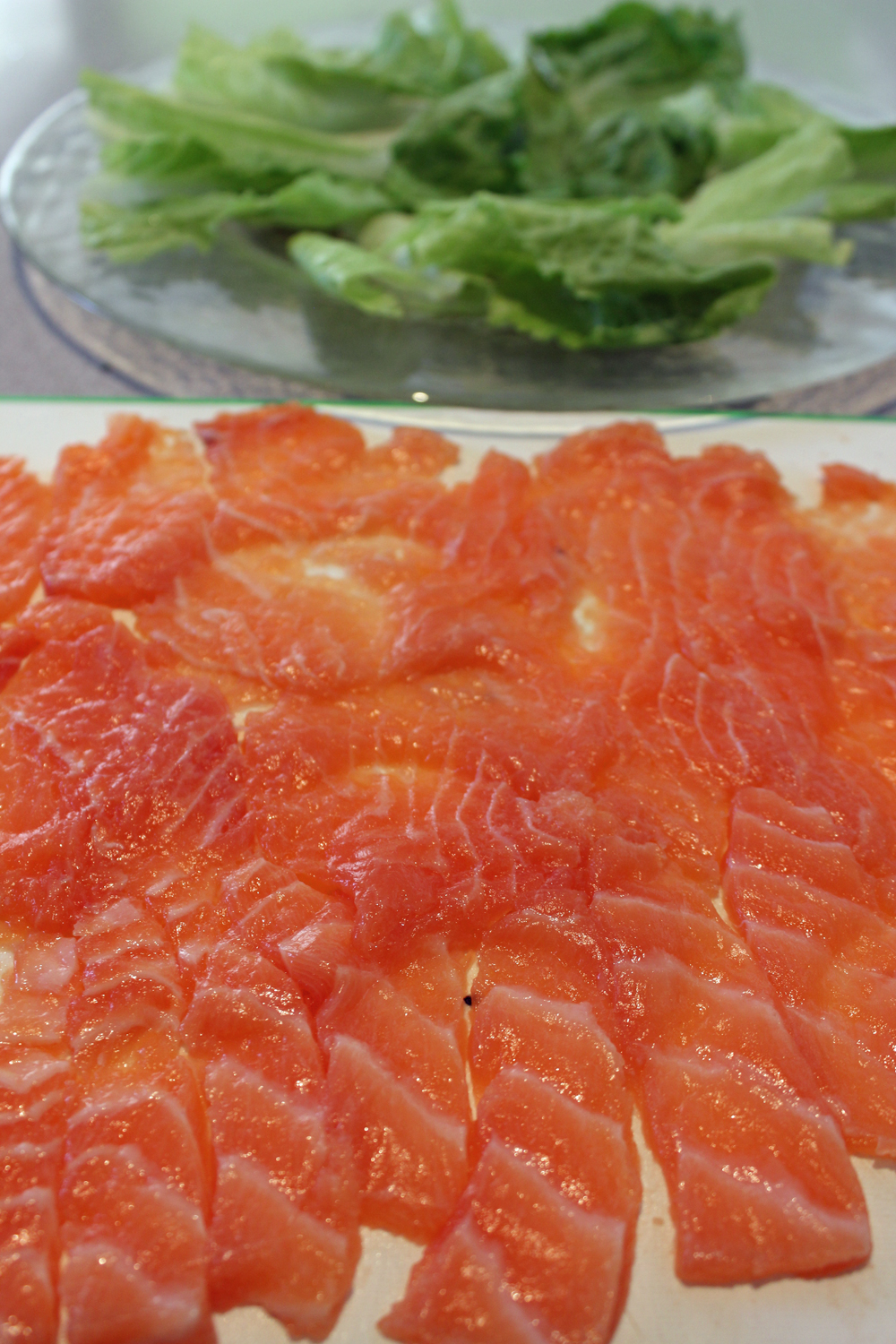 1. חותכים את הסלמון לפרוסות דקות. משטחים על קרש חיתוך, מניחים מעל ניילון נצמד ומרדדים לעובי של נייר. חותכים למלבנים בגודל ביס.