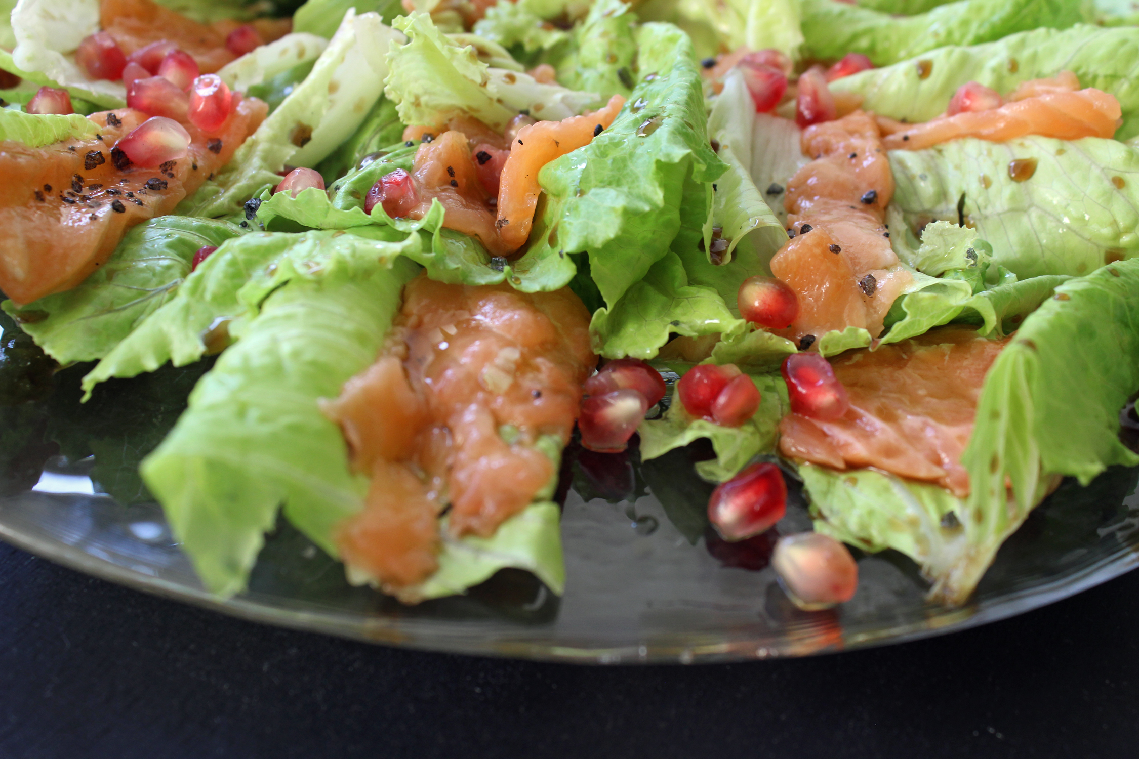 3. מזלפים שמן זית ובלסמי על תחתית צלחת הגשה, מערבבים ומורחים על כל הבסיס. מניחים מעל קרעי חסה ובכל אחד מניחים חתיכת סלמון. ממלאים את הצלחת. מזלפים מעל עוד שמן זית ובלסמי ומתבלים במלח גס. מפזרים גרגרי רימון. אם נדרשת קומה שניה של חסה וסלמון, מתבלים קומה ראשונה לפני שמניחים מעליה את השניה.