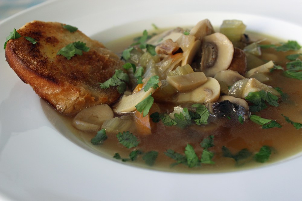 בקיצור – בסיר הבישול, על שמן זית מקפיצים בצל, גזר ו-2 גבעולי סלרי קצוצים. מוסיפים פטריות פרוסות ומים. מתבלים במלח ופלפל ומבשלים כ-15-20 דקות למיזוג הטעמים. בהגשה מוסיפים טוסט מרוח בשמן זית ושום.