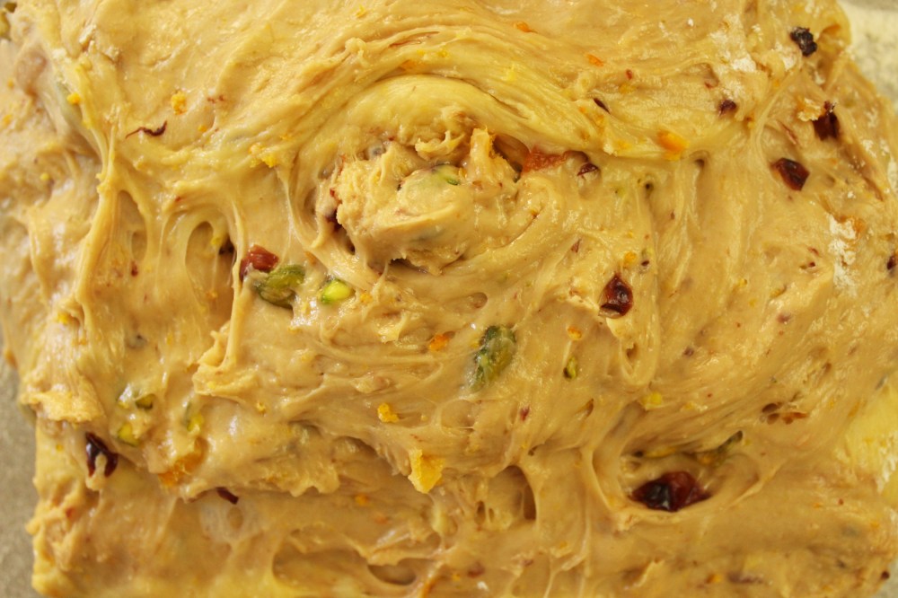 5. מוסיפים בזה אחר זה את שאר התוספות, כל אחת לאחר הטמעת הקודמת. מתחילים עם הפיסטוקים ואחריהם קליפות התפוז, המישמש, הדובדבנים והחמוציות. לשים עד שהפירות מתפזרים בכל הבצק.