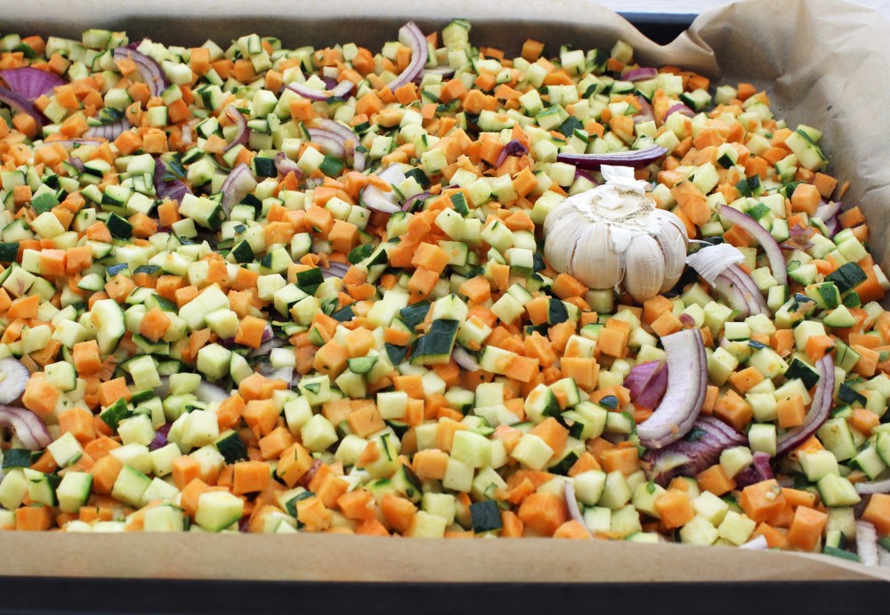 4. מרפדים תבנית בנייר אפיה, מניחים מעל את הירקות החתוכים.