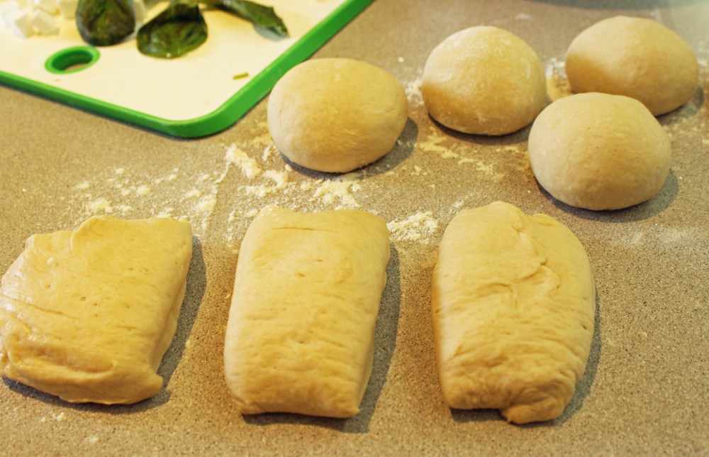 5. מרכיבים: מקמחים קלות את משטח העבודה. מוציאים את הבצק מהקערה, יוצרים מעין נחש שמנמן וחותכים את הבצק ל-8 יחידות בגודל זהה (או ליותר, אם רוצים אפים קטנים יותר).