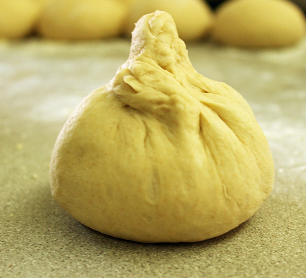 6. אוספים את הקצוות של כל יחידת בצק למרכז היחידה, הופכים על משטח עבודה מקומח קלות ומכדררים לכדור. מניחים בצד ומכסים במגבת. בצורה זו יוצרים 8 כדורים.