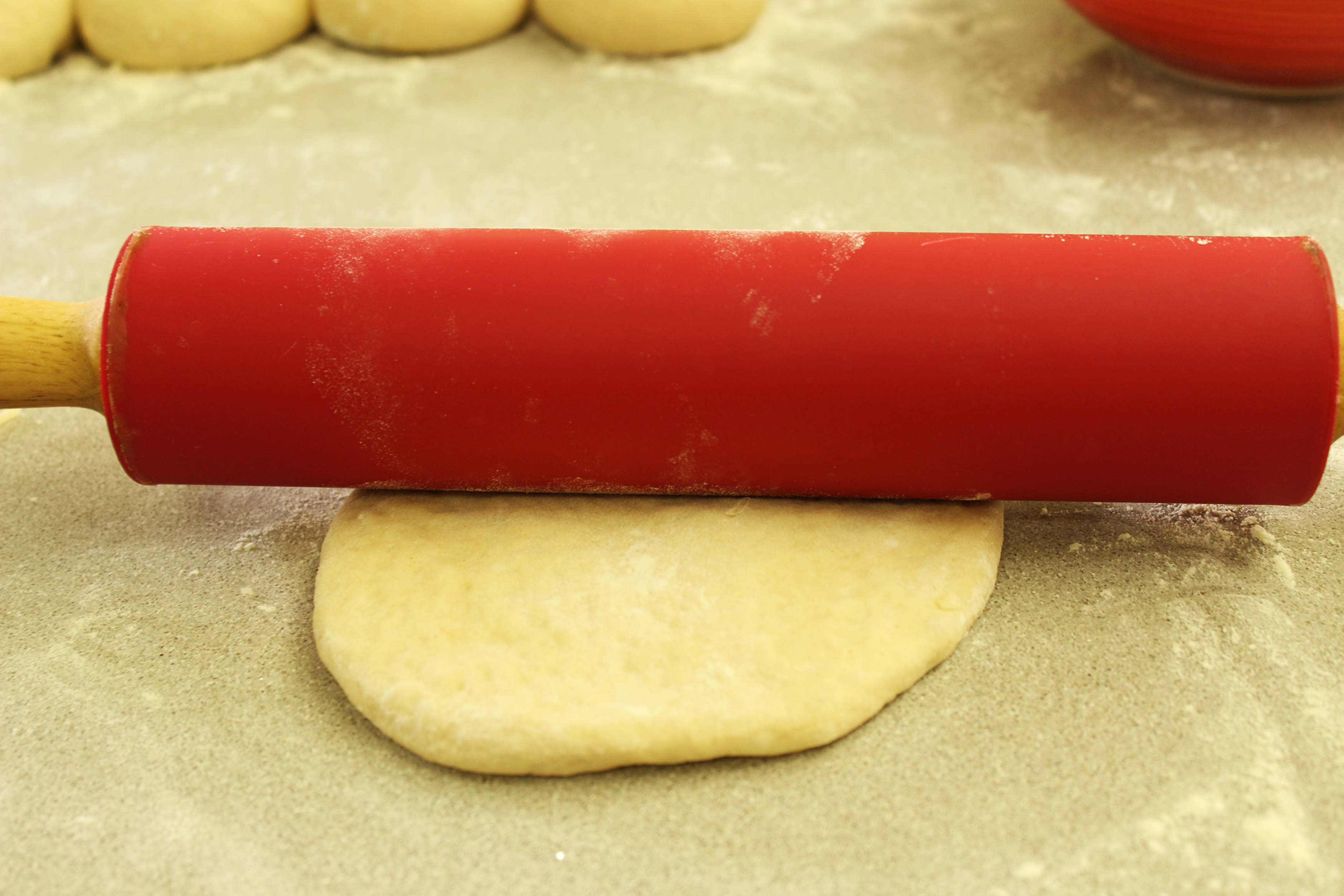 11. מרדדים בעדינות עם מערוך מבלי לקרוע את הבצק, לעיגול בקוטר של כ-15 ס"מ. זה השלב שבו אפשר להחליט אם רוצים פיתה ממולאת או בייגלה ממולא. להכנת הבייגלה רצוי להסתכל בסרטון המצורף. להכנת הפיתה ממשיכים כמפורט להלן.