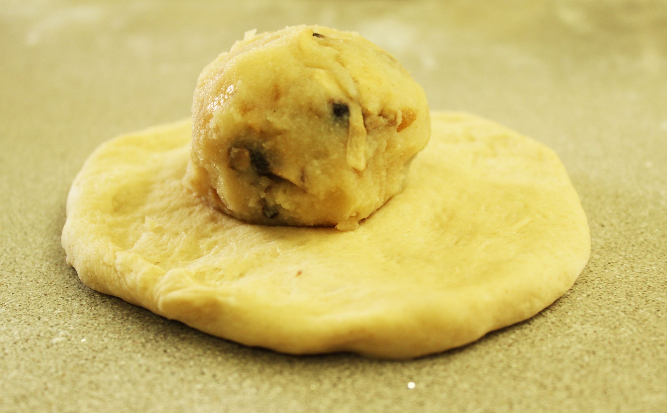 8. נוטלים כמות נדיבה מהמלית ומניחים במרכז העיגול. מהפירה יוצרים כדור בגודל כדור טניס. מהגבינות נוטלים כרבע מהכמות (או כמה שעיגול הבצק יכול להכיל).
