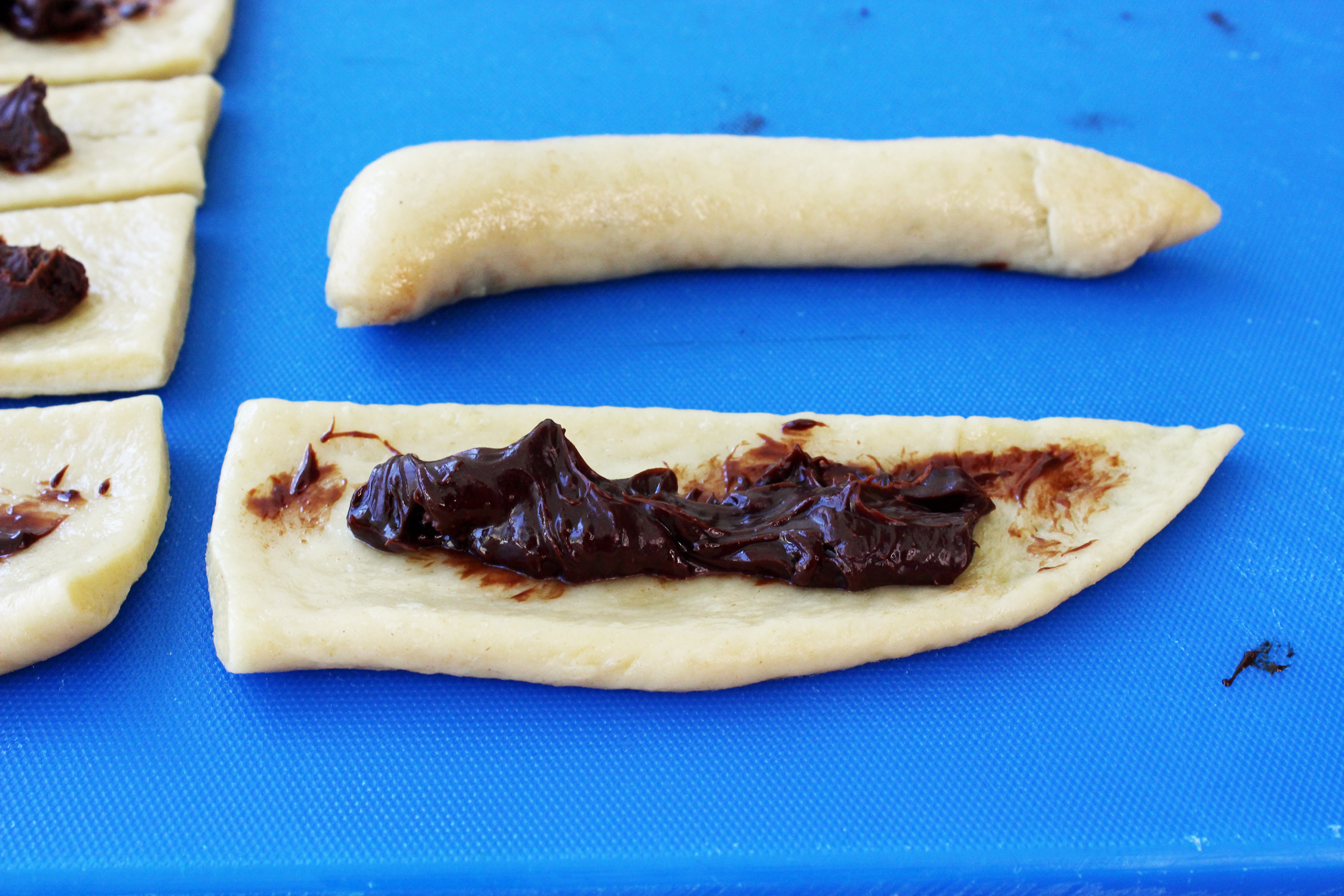 מרדדים את המחצית השניה של הבצק למלבן בעובי של כ-3 מילימטרים ומחלקים ל-8 מלבנים. מניחים את נחש השוקולד לאורך באמצע המלבן. מגלגלים מהצד הצר מעל לפס השוקולד. מהדקים את החיבור בסוף הגלגול. מהדקים גם את הקצוות מימין ומשמאל.