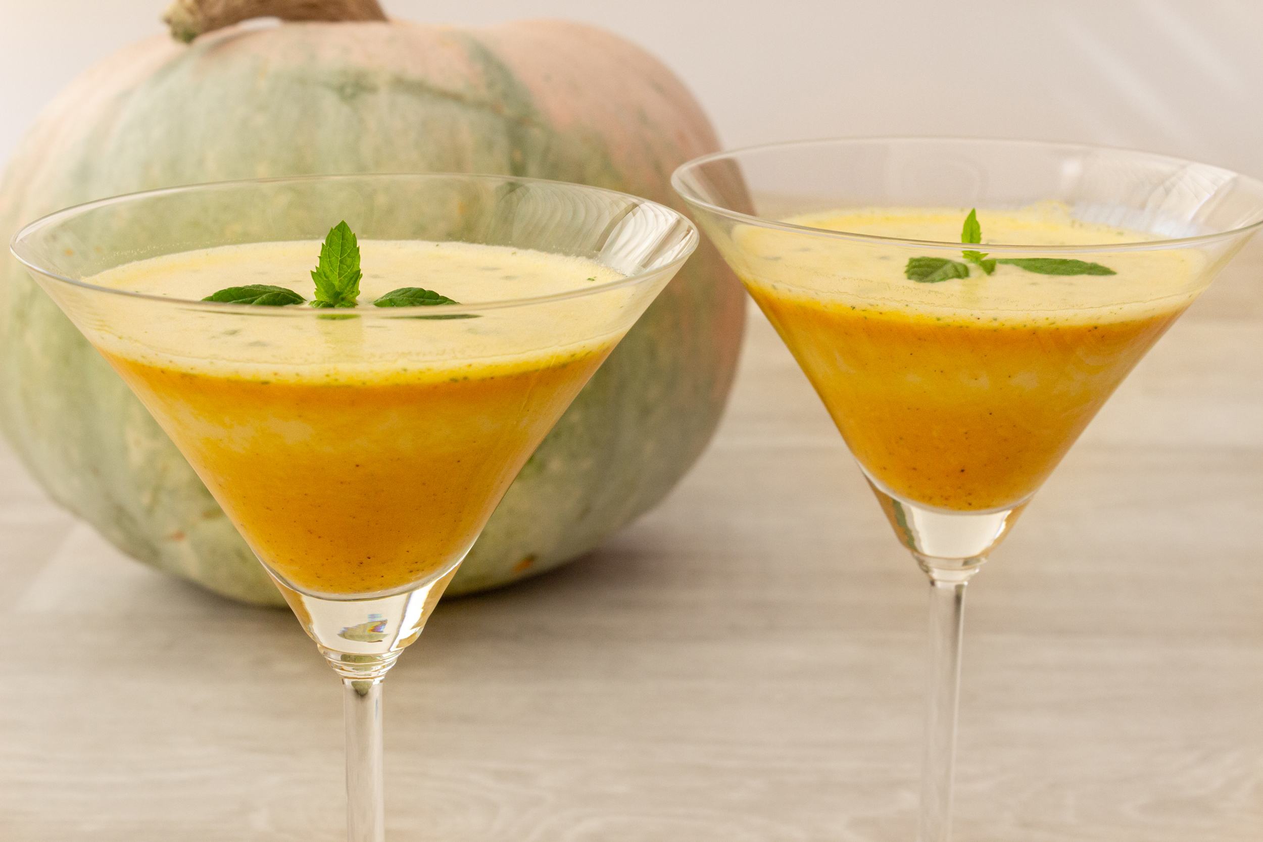 2. מכניסים את כל מרכיבי המנה עם מחית הדלעת לבלנדר ומערבבים היטב לקבלת משקה חלק שייראו בו חתיכות קטנטנות של נענע טריה. טועמים ומתקנים תיבול. מצננים היטב.