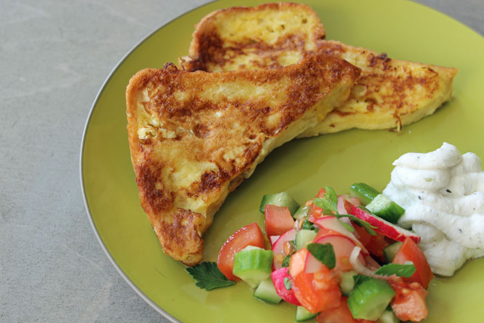טעימה מאוד גם בגרסה מלוחה עם סלט ירקות, נטו חלה מטוגנת, לפני הוספת הקצפת ושאר הפינוקים. למעשה, אני אוכלת את הפרוסה הראשונה עם סלט קצוץ, שהמיץ שלו נוגע בחלה ומקפיץ את טעמה, ואת הפרוסה השניה בגרסה מתוקה: החל מסוכר חום שנמס עליה בעודה חמה ועד השידרוגים שבצילום.