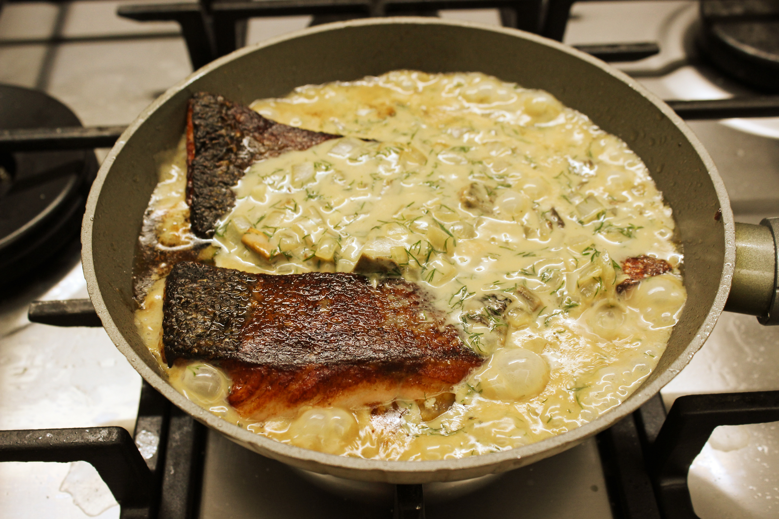 הופכים את הסלמון במחבת כך שהעור כלפי מעלה, צורבים כ-10שניות ומוסיפים את הרוטב. מוודאים שהוא מכסה את כל הדג, כמעט עד העור. לצורך זה אם צריך, מוסיפים מעט מים חמים.