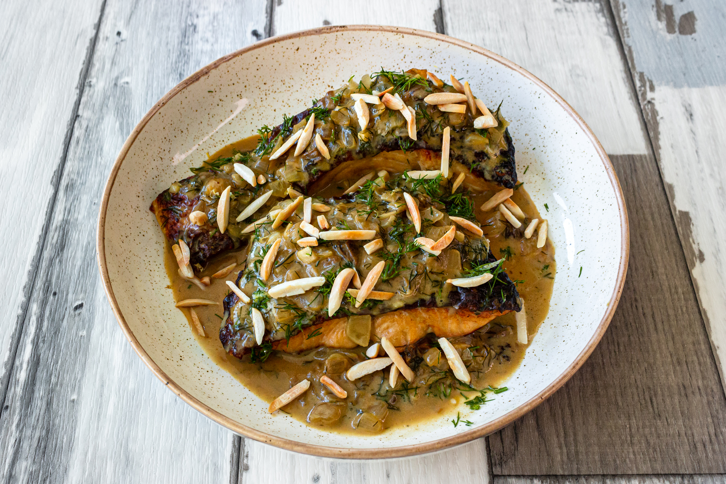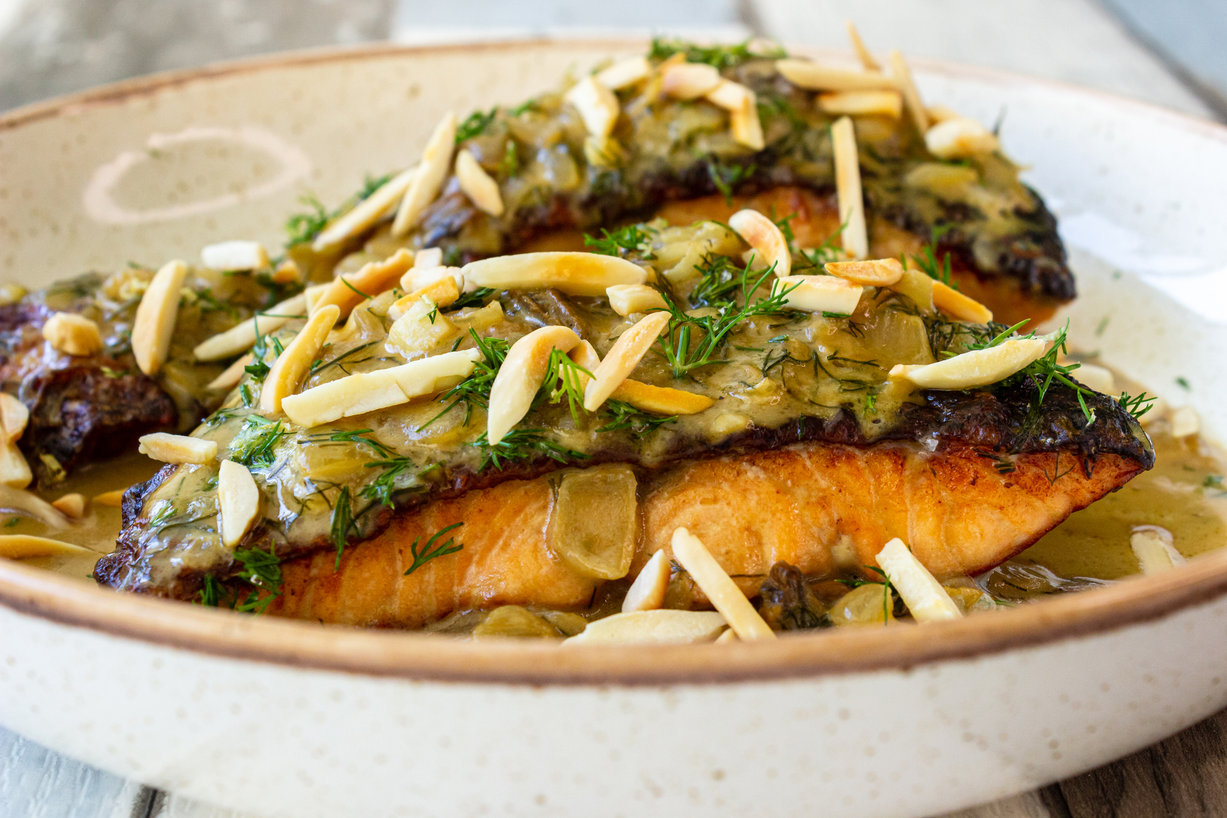 מניחים את הסלמון על כלי הגשה, יוצקים מעליו את הרוטב , מפזרים מעל את תערובת השמיר וגרידת הלימון ומעליהם את השקדים.