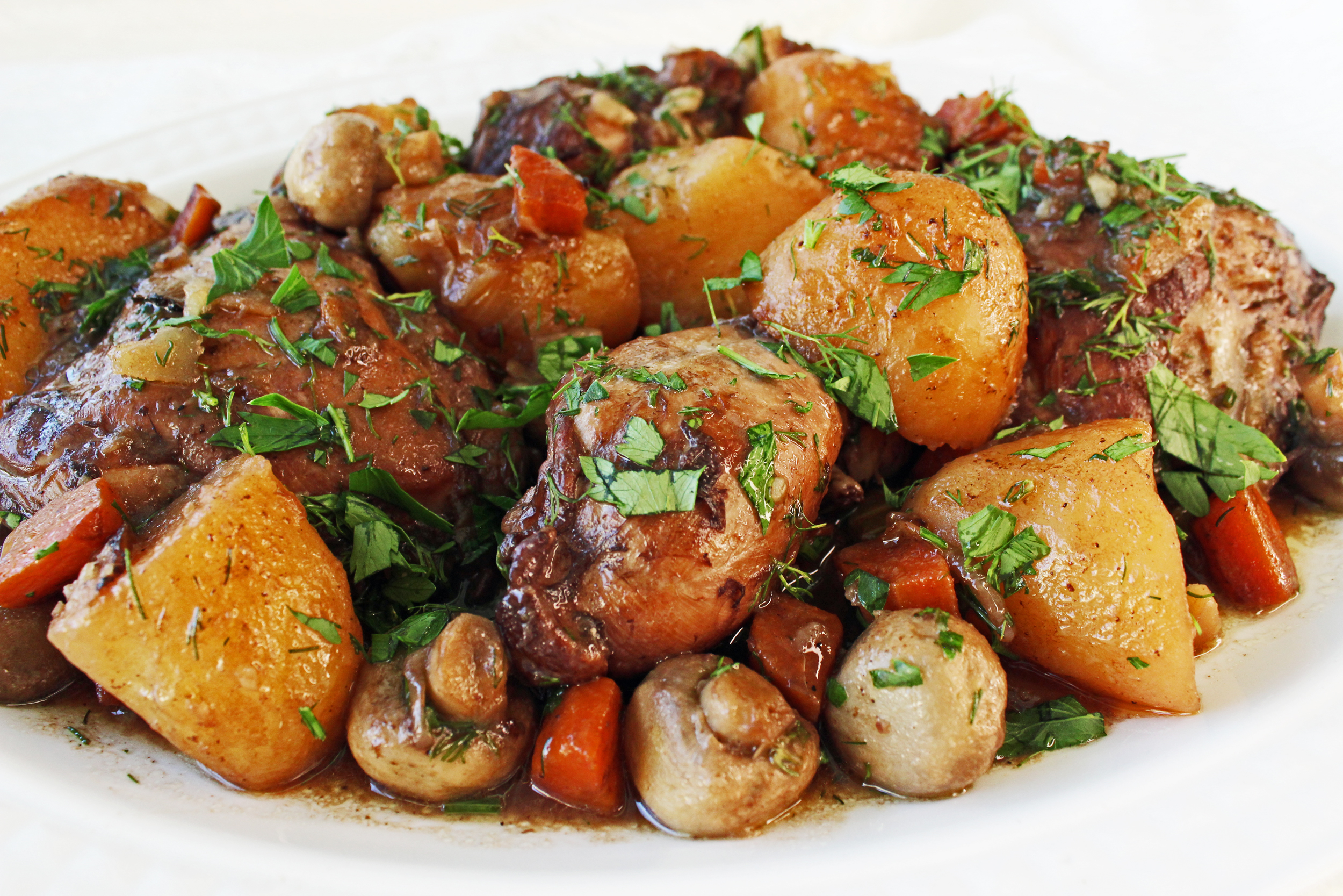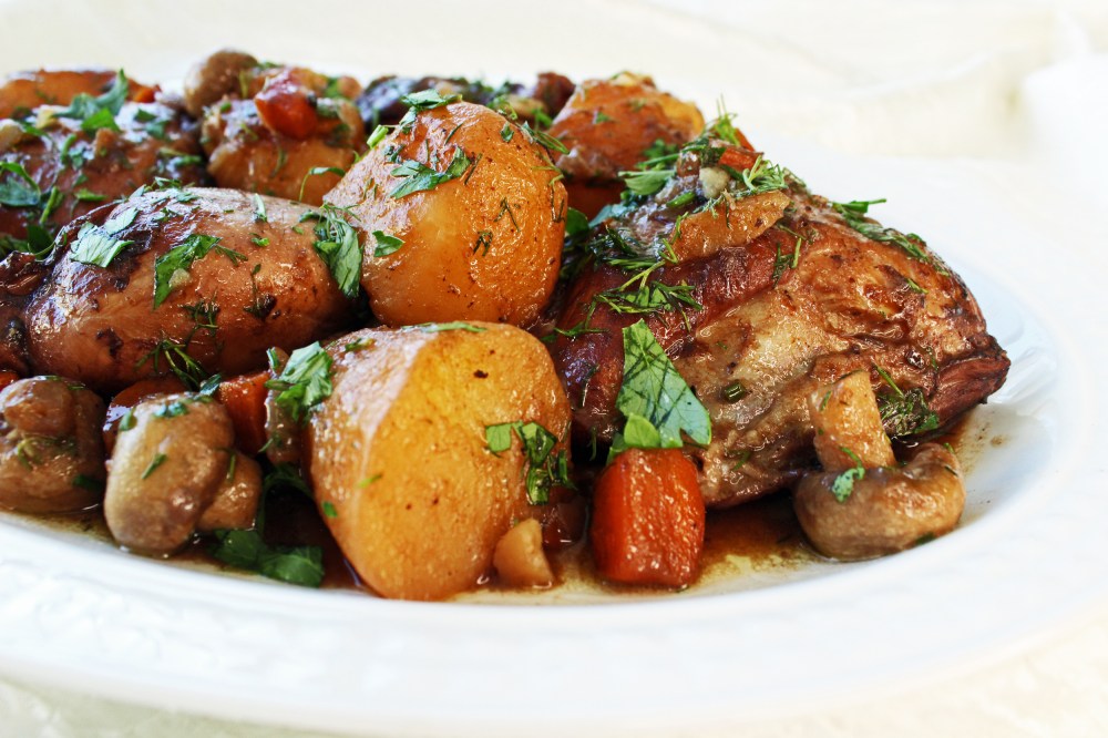 ותיקי העוקבים אחרי הבלוג משחר נעוריו זוכרים בודאי, שגרסה קלה של עוף ביין ותבלינים כבר הופיעה בו. וישנן אפילו שתי גרסאות. עכשיו מגיע תורה של הגרסה המוקפדת יותר, עם עומק טעמים שלא היה בגרסאות המהירות. זו מגיעה לכאן בהשראת ה-cok au vin הצרפתי שחזרתי אליו באחרונה. הקלאסיקה הצרפתית לא כוללת את תוספת תפוחי האדמה, אולם אלה מקבלים טעם כל כך טוב מאחיהם לסיר, כך שהם בבחינת בונוס.