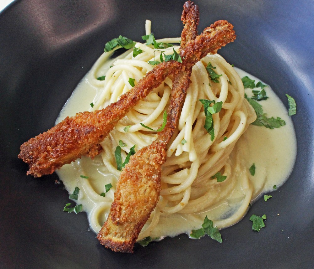 מנה נפלאה גם כשמשתמשים בארטישוק משומר בשמן חמניות, יבוא מאיטליה. מצאתי אותו בחנות טבע (אניס) וזו היתה אהבה ממבט ראשון. אפשר לרכוש אותו שלם, או חתוך לרבעים. בגלל פערי המחירים (השלם יותר יקר) השתמשתי בשני הסוגים. לרוטב אפשר להשתמש ברבעים, ואילו לארטישוק הקריספי מומלץ להשתמש בשלם.