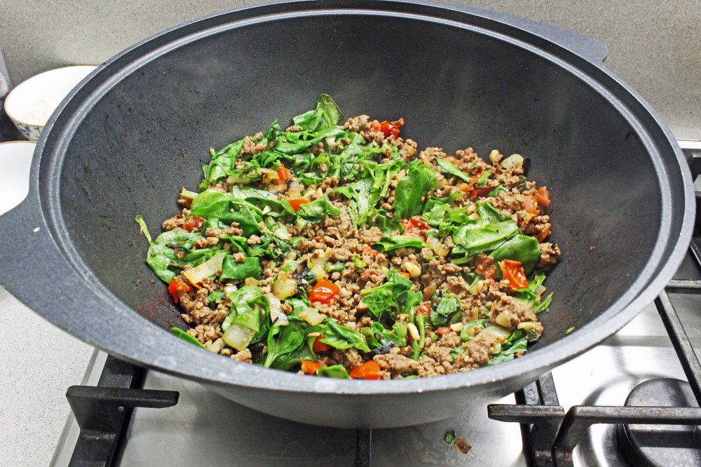 מכניסים את הבשר הטחון ומקפיצים עד שהוא משנה צבע והופך גרגרי. מצרפים את העגבניות והתרד ומקפיצים יחד.