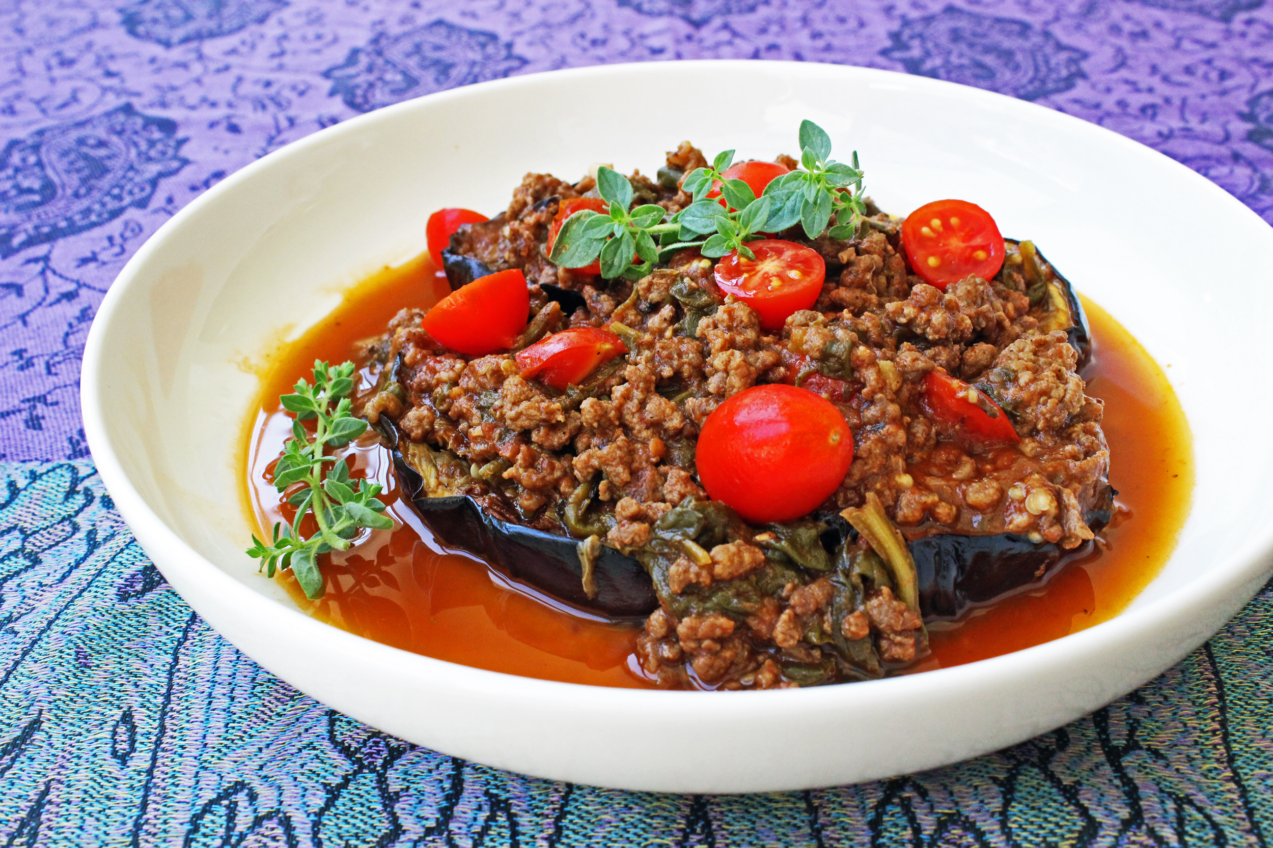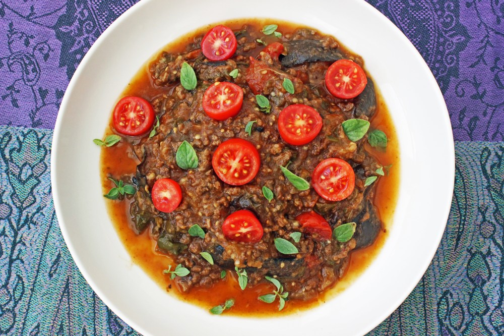 בהשראת אותה מנה יצרתי את תבשיל הקיץ הזה. את החציל העדפתי לחתוך לעיגולים, כדי שכל אחד יקח את המנה בגודל שמתאים לו. משיקולי בריאות הוספתי תרד ניו זילנדי ועגבניות שרי. וגם רסק עגבניות איכותי (MUTTY). אני לא יודעת אם הוא היה במקור, אבל הוא השתלב נפלא.