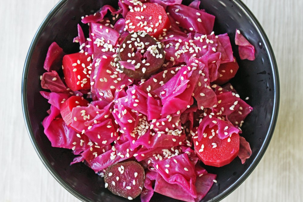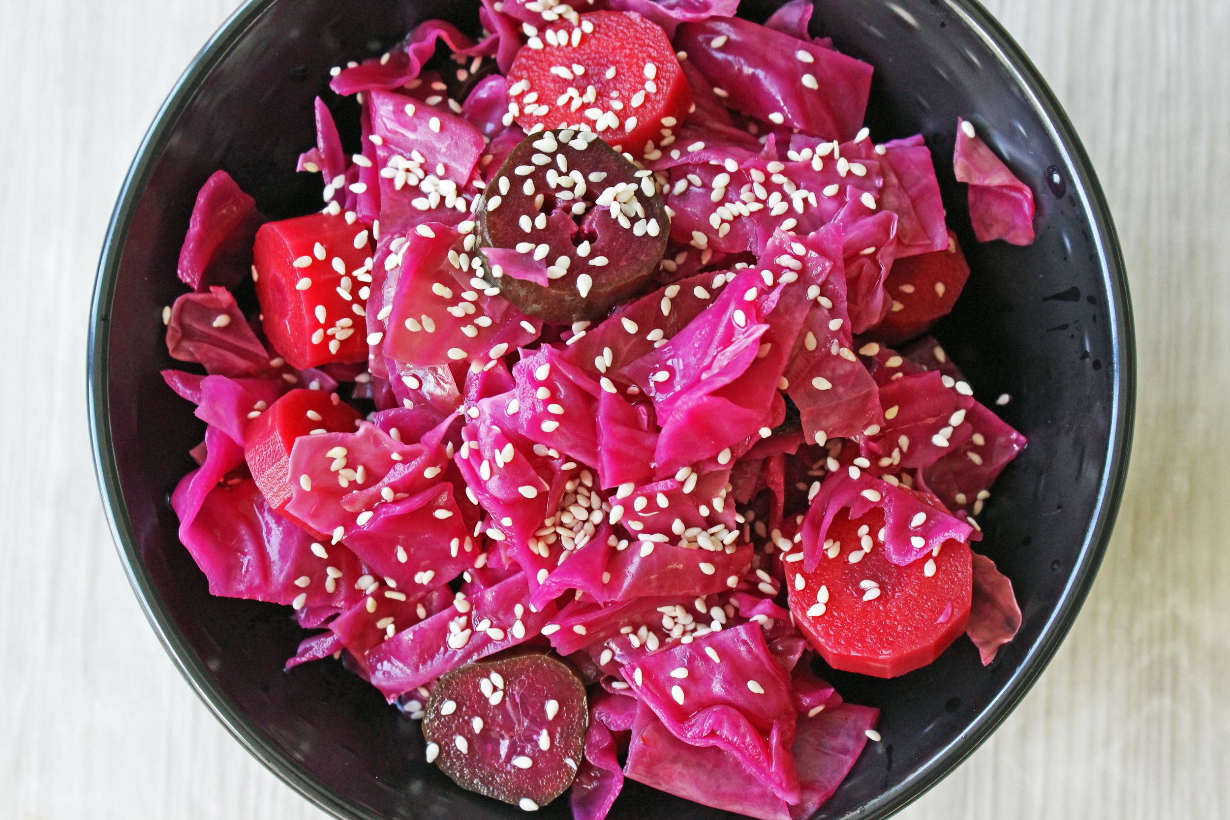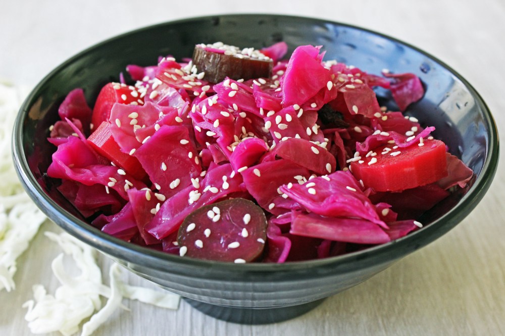 הקימצ'י היפני קל ביותר להכנה. המתכון המקורי הוא עם כרוב לבן. אני השתמשתי בסגול (יותר נוגדי חימצון) והרווחתי גם צבע נהדר. את התבלינים אפשר לשנות לפי הטעם.המתכון המקורי של השף כולל 2 כפות מלח. אני השתמשתי (בטעות, ככה זה כשמכינים מהזכרון) בכף אחת והתוצאה היתה ממכרת לא פחות. אז לבחירתכם, רק זכרו שמלח זה לא הכי בריא.