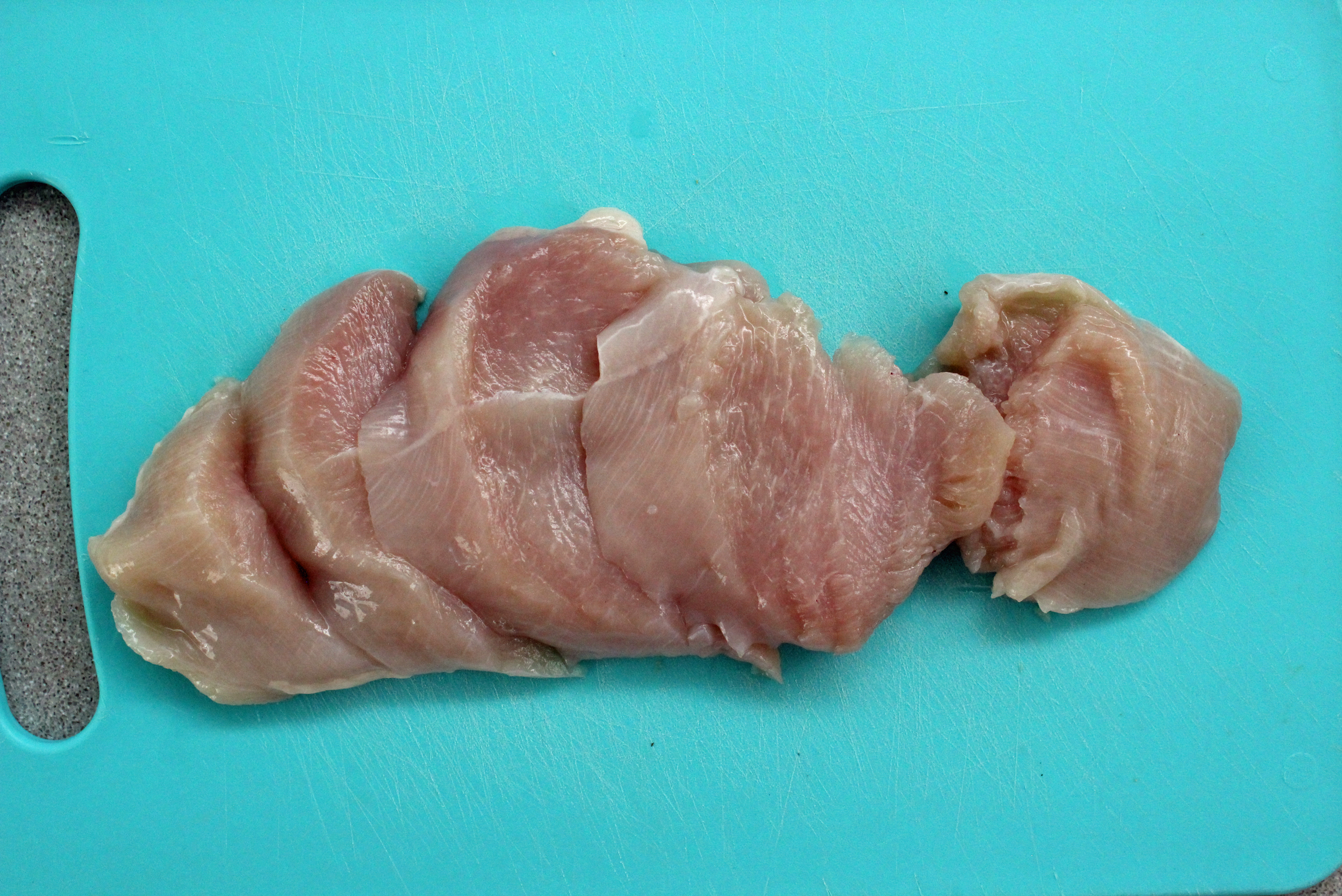 פורסים באלכסון את חזה העוף ל-4-5 פרוסות עבות (ראו צילומי שלבים בהמשך).