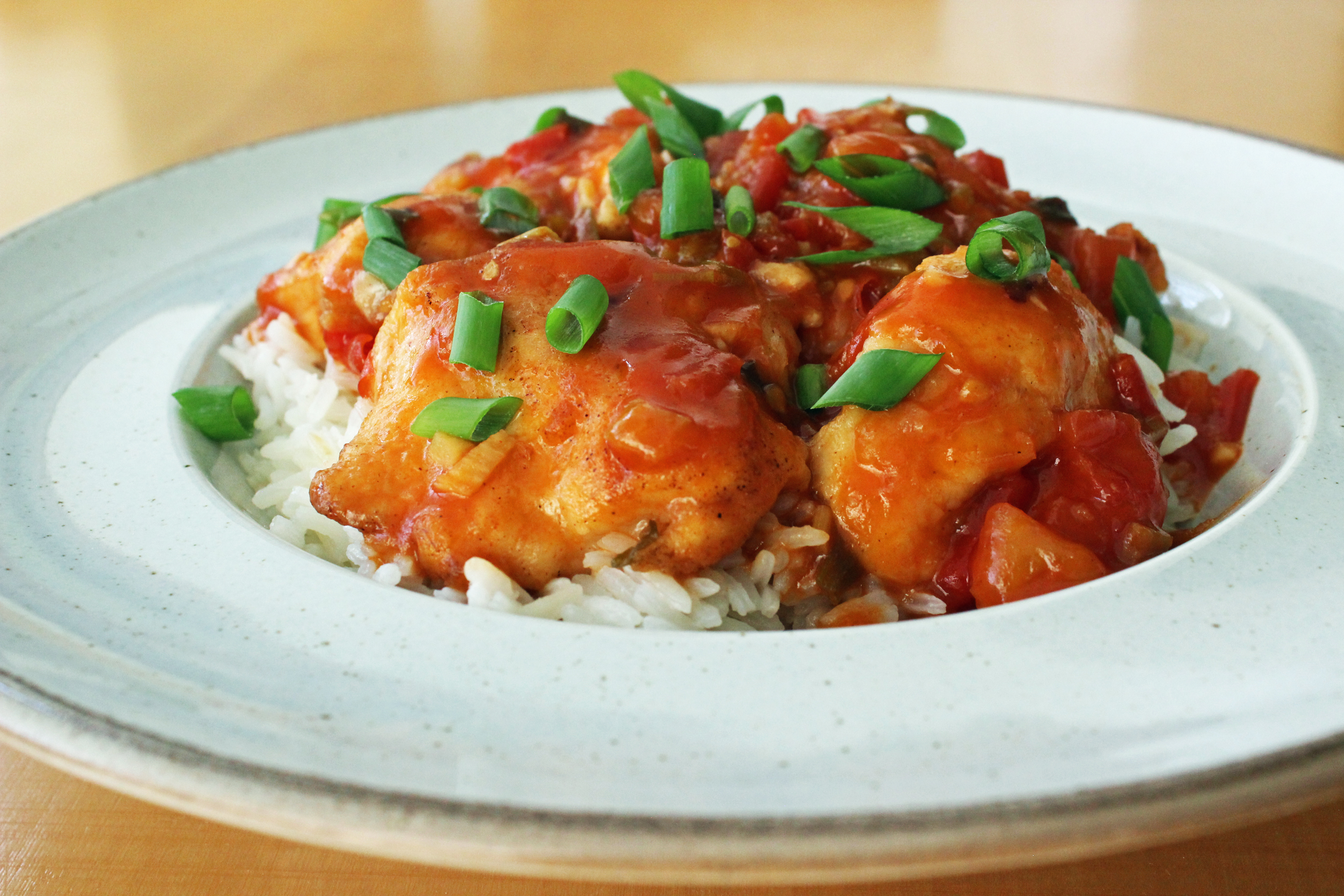 מעבירים את העוף לרוטב כך שיצפה אותו ומניחים אותו מעל אורז מבושל.