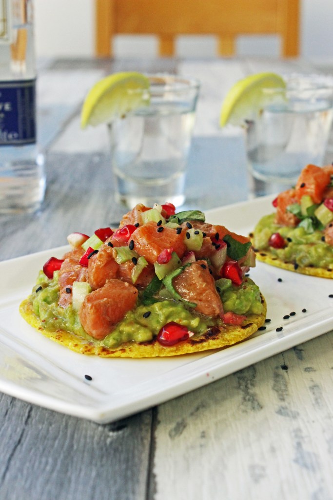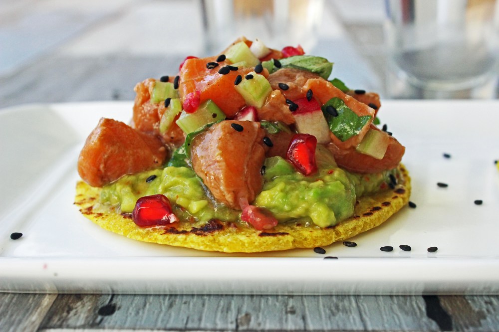 ההרכבה – מניחים טורטיה, עליה כף נדיבה של מימרח האבוקדו ומעל את הסשימו. אפשר לפזר גרגרי רימון שומשום שחור מעל המנה.