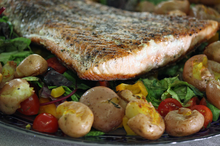 סלמון עם תפו"א וסלט ירקות. גם עם אורז זו מנה מעולה.