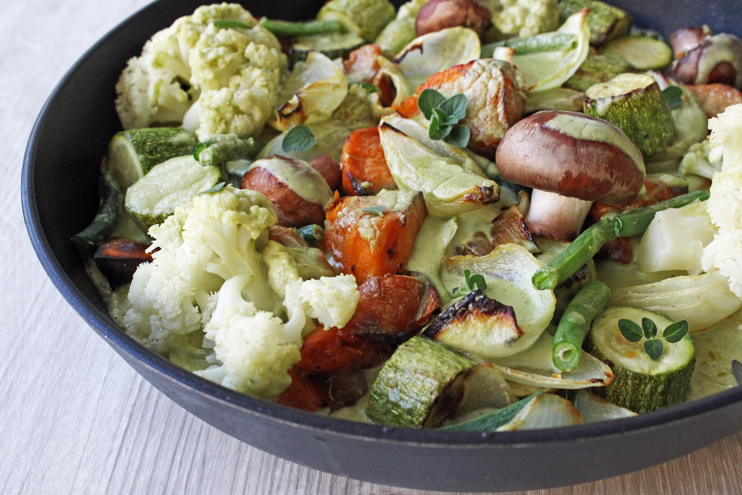 מניחים נייר אפיה בתבנית. מניחים עליו את הבטטה, הקישואים והבצל. מתבלים בשמן זית, מלח ופלפל ומערבבים. קולים בטמפרטורה גבוהה עד שהם נצרבים בקצוות והופכים אלדנטה (החלק הפנימי עדיין מעט קשה). העגבניות יכולות להתרכך לחלוטין.