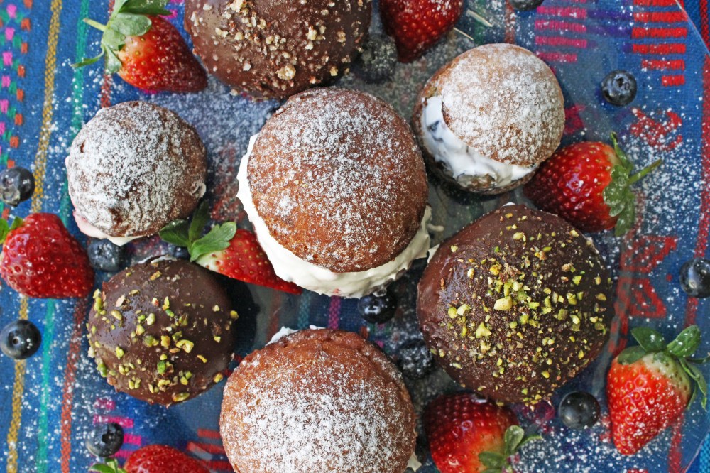 סופגניות שוקולד פיסטוק וסופגניות מריטוצו בהשראה איטלקית הן שני טעמים חדשים שהוספתי השנה למאגר הסופגניות ההולך ותופח. מי שרוצה יכול לשלב את שניהם לסופגניה אחת שופעת טעמים.