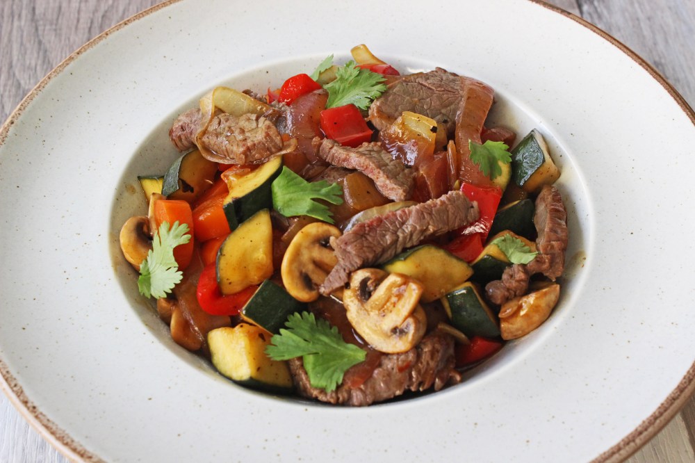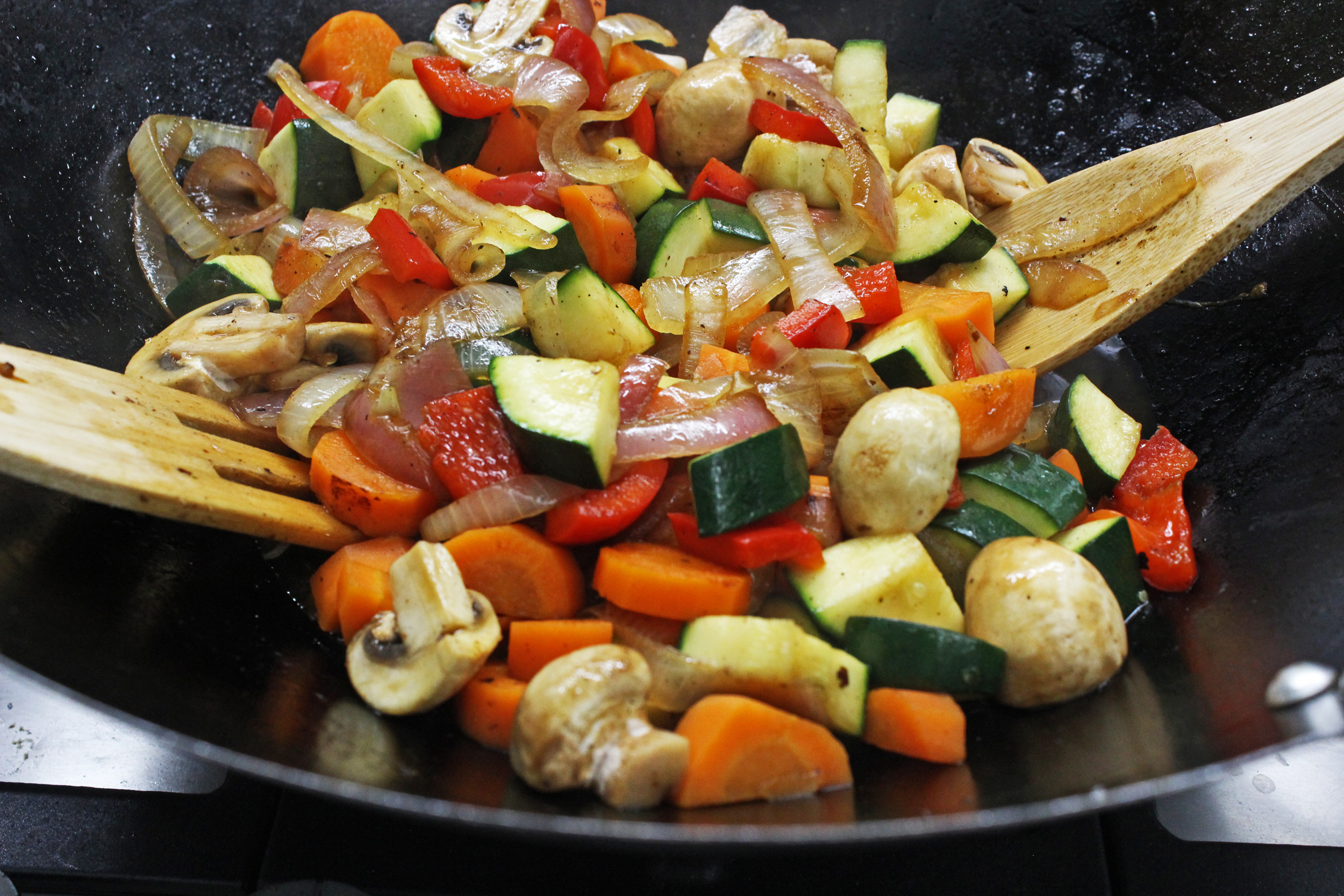 מחממים שמן זית במחבת בו הוכן הבקר/עוף. מכניסים בזה אחר זה בצל, גזר, חציל, פלפל וזוקיני ומקפיצים עד שהחציל מתרכך ושאר הירקות מעט פריכים. מוסיפים את הפטריות ומקפיצים כדקה נוספת.