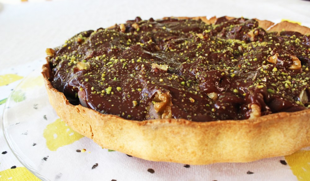 ההרכבה: מניחים את חציאי האגסים הפרוסים על הבסיס האפוי. מפזרים ביניהם אגוזי מלך קצוצים. יוצקיםם מעל רוטב שוקולד ומעליו מפזרים פיסטוק מרוסק. מעבירים לצינון במקרר ולהתמצקות של השוקולד, כדי להקל על הפריסה. בהגשה אפשר לחמם כל פרוסת פאי במיקרו 15-20 שניות.