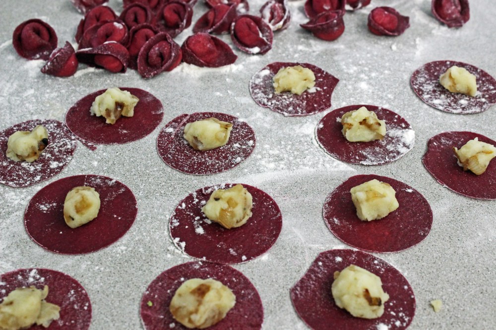 לבצק- מכניסים לקערה את הקמח ויוצרים במרכז גומה. מצרפים את פירה הסלק ויוצרים גם בו גומה. מצרפים ביצה ומלח. מערבבים הכל ולשים לבצק סגול חלק, כ-10 דקות.