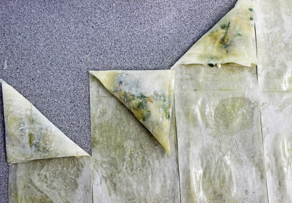 משולש הפילו שלנו ממוקם בצד שמאל של הרצועה. עכשיו מקפלים אותו בעדינות לכיוון הצד הימני שלה. ממשיכים לקפיל לכיווננו, ישר למטה על הצד הימני. חוזרים על הפעולות מהתחלה: שמאלה: אלכסון וישר. ימינה: אלכסון וישר. עד שנשארים עם שולי בצק מיותרים. אפשר לחתוך אותם, או לקפל על תחתית הבורקס. רק שימו לב, רצוי למרוח מעט שמן זית על הקצה שנותר בצד שיפגוש את שאר הבורקס, כדי להבטיח פריכות מלאה.