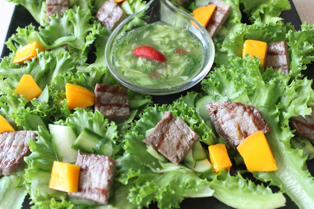 הרכבת המנה: נוטלים עלה חסה, מניחים עליו רצועות מלפפון לאחר שניערנו מהן עודפי רוטב. מעל מניחים את חתיכות הסטייק/שניצל או הפטריות. מצרפים את האננס המקורמל ואם רוצים גם טבעת צ'ילי חריף.